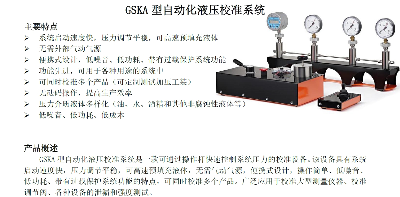GSKA 型自動化液壓校準系統(tǒng)是一款可通過操作桿快速控制系統(tǒng)壓力的校準設(shè)備。該設(shè)備具有系統(tǒng)啟動速度快,壓力調(diào)節(jié)平穩(wěn),可高速預(yù)填充液體,無需氣動氣源,便攜式設(shè)計,操作簡單、低噪音、低功耗、帶有過載保護系統(tǒng)功能的特點,可同時校準多個產(chǎn)品。廣泛應(yīng)用于校準大型測量儀器、校準調(diào)節(jié)閥、各種設(shè)備的泄漏和強度測試。