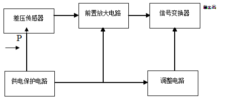 擴(kuò)散硅差壓變送器工作原理為:過程壓力作用在傳感器上,傳感器即輸出與壓力成正比的電壓信號,電壓信號通過放大電路轉(zhuǎn)化為4—20mA標(biāo)準(zhǔn)信號。其供電保護(hù)電路為傳感器提供激勵,此傳感器采用了精密溫度補(bǔ)償電路。其工作原理框圖如下: