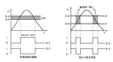 該功能可用于監(jiān)控特定的區(qū)間,其輸出可用來完成控制、報(bào)警等工作,且只需一個(gè)輸出點(diǎn)。如右圖所示,以常開型(N.O)為例,灰色帶為窗口值(ALxF -ALxH);當(dāng)壓力值處于窗口之間時(shí),開關(guān)點(diǎn)才吸合;而當(dāng)壓力值超出該區(qū)間時(shí),開關(guān)點(diǎn)斷開。