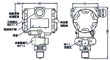 信號(hào)端子設(shè)置在電氣盒的獨(dú)立艙內(nèi)。在接線(xiàn)時(shí),可擰下接線(xiàn)側(cè)的表蓋。電源是通過(guò)信號(hào)線(xiàn)接到變送器的,不需要另外的接線(xiàn)。