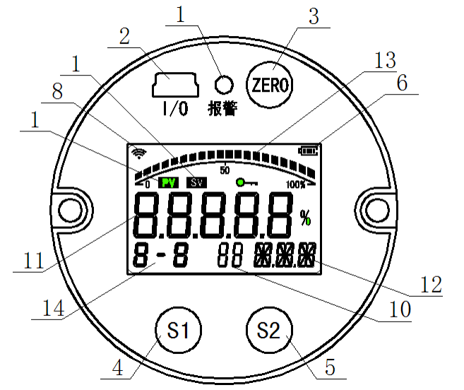 五、顯示說明:無線一體壓力變送器顯示面板如圖二: